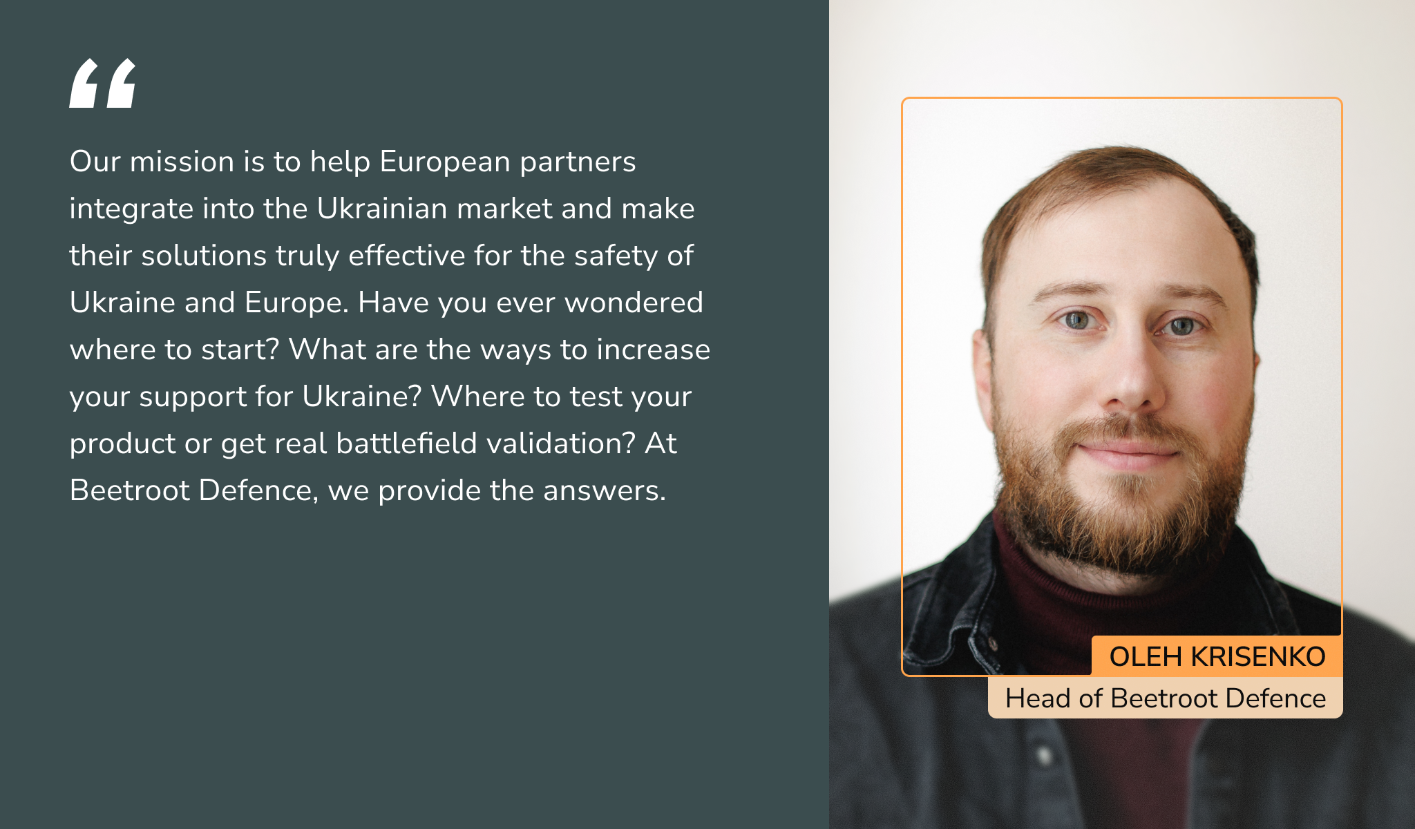 Our mission is to bridge Ukraine and Europe in DefenceTech. Beetroot Defence is led by Oleh Krisenko, a veteran with over ten years of service in the Armed Forces of Ukraine. His experience shapes the direction with clarity and pragmatism.